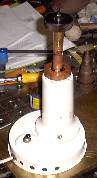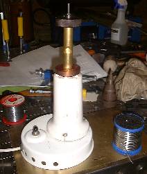 De eerste stap bestaat er nu in de goed gereinigde en met aceton ontvette pijponderdelen te assembleren, waarbij we meteen een laagje vloeimiddel op de te solderen naden en verbindingen aanbrengen. Zorg ervoor dat er zeker geen vloeimiddel in of op de kernspleet terecht komt. We plaatsen de geassembleerde pijp met roodkoperen voetstuk bovenop de bunsenbrander en verhitten het geheel. Het duurt ongeveer 6 a 10 minuten vooraleer het werkstuk op temperatuur is gekomen. Het objekt bovenop de orgelpijp is een grote stalen kartelmoer die hier dienst doet als gewicht om de onderdelen tijdens het solderen zeker op hun plaats te houden. Eender welk zwaar rond en vlak objekt kan daarvoor natuurlijk dienst doen. Belangrijk is wel dat de werktafel zuiver waterpas is opgesteld.