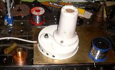 Elektrische bunsenbrander 500Watt (Elektrobrenner Merk: dr.Hofmann), voorzien van een externe triac temperatuurregeling. Rechts op de foto staat een rol AgSn soldeer (zachtzilver soldeer, diameter 2.8mm), links staat een rol SnPb (zoals gebruikelijk in elektronika, diameter 0.6mm) soldeer klaar. Een losse pijpvoet met kern staat klaar links vooraan op de foto. De klankbuis met het labium ligt er vlak achter.