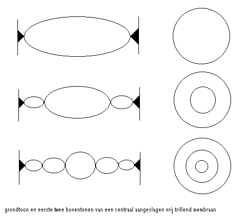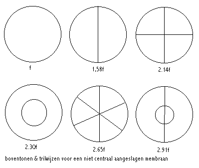 De fundamentele inzichten die we aanhaalden in onze bespreking van trillende snaren, zijn ondanks deze komplexiteit ook op membranen van toepassing: de grondtoon is een funktie van de kracht waarmee het membraan over zijn omtrek wordt aangespannen. De grondtoon daalt naarmate de diameter van het membraan groter wordt genomen. De grondtoon zakt ook wanneer het materiaal dikker wordt gekozen en dus de massa ervan groter wordt.