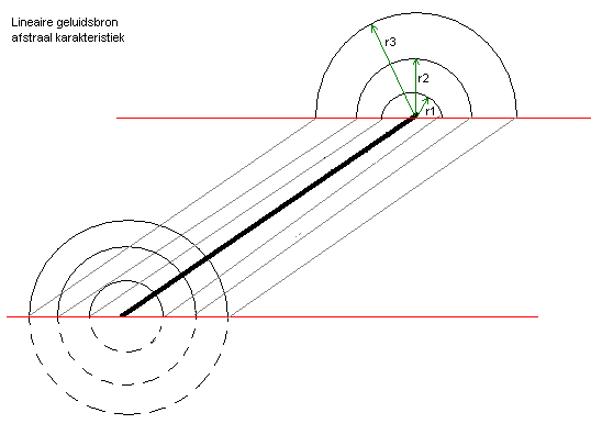 De beschouwing voor sferische stralers in de vrije ruimte waarbij we stelden dat de geluidsdruk afnam met het kwadraat van de afstand tot de bron kan bij lineaire geluidsbronnen beslist niet aangehouden worden. Immers, de geluidsgolven vormen nu geen bol maar een cylinder. Hiervan neemt de oppervlakte toe recht evenredig met de diameter. Het geluid veroorzaakt door een lineaire bron en gemeten op een punt op een zekere afstand zal dan ook slechts afnemen evenredig met die loodrechte afstand tot die bron.