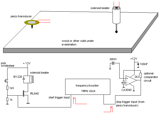 De schakeling en opstelling werkt wanneer we de schakelaar kort indrukken: het kloppertje tikt tegen het materiaal en de chrono wordt gestart. Wanneer de piezo de eerste puls ontvangt (eventueel moet een voorversterker of een komparatorschakeling -hierboven getekend- toegepast worden, afhankelijk van de instelmogelijkheden voor de gevoeligheid van de gebruikte counter), stopt de counter. Triggering moet gebeuren op de stijgende flank van het signaal. Op het display lezen we onmiddelijk de tijd in microsekonden af die de puls nodig had om zich van het kloppertje naar de piezo voort te planten. Wanneer we nu de afstand tussen beide punten precies meten met de schuifpasser, is de voortplantingssnelheid in die richting heel eenvoudig te berekenen. (v = s/ t)