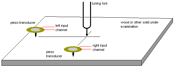 Prik de piezotransducers op een met de schuifpasser bepaalde gelijke afstand van een punt op het houtoppervlak zo dat beide assen een rechte hoek vormen en bovendien een van beide assen evenwijdig loopt met de vezelrichting van het hout. Markeer het referentiepunt want dit wordt de plek waar we middels de stemvork een trilling doorheen het stuk hout gaan sturen. Start het programma op de PC op voor klankopname naar disk. Sla de stemvork aan en druk ze zo precies mogelijk op het gemarkeerde punt. Wanneer de stemvork is uitgetrild stop je de opname.