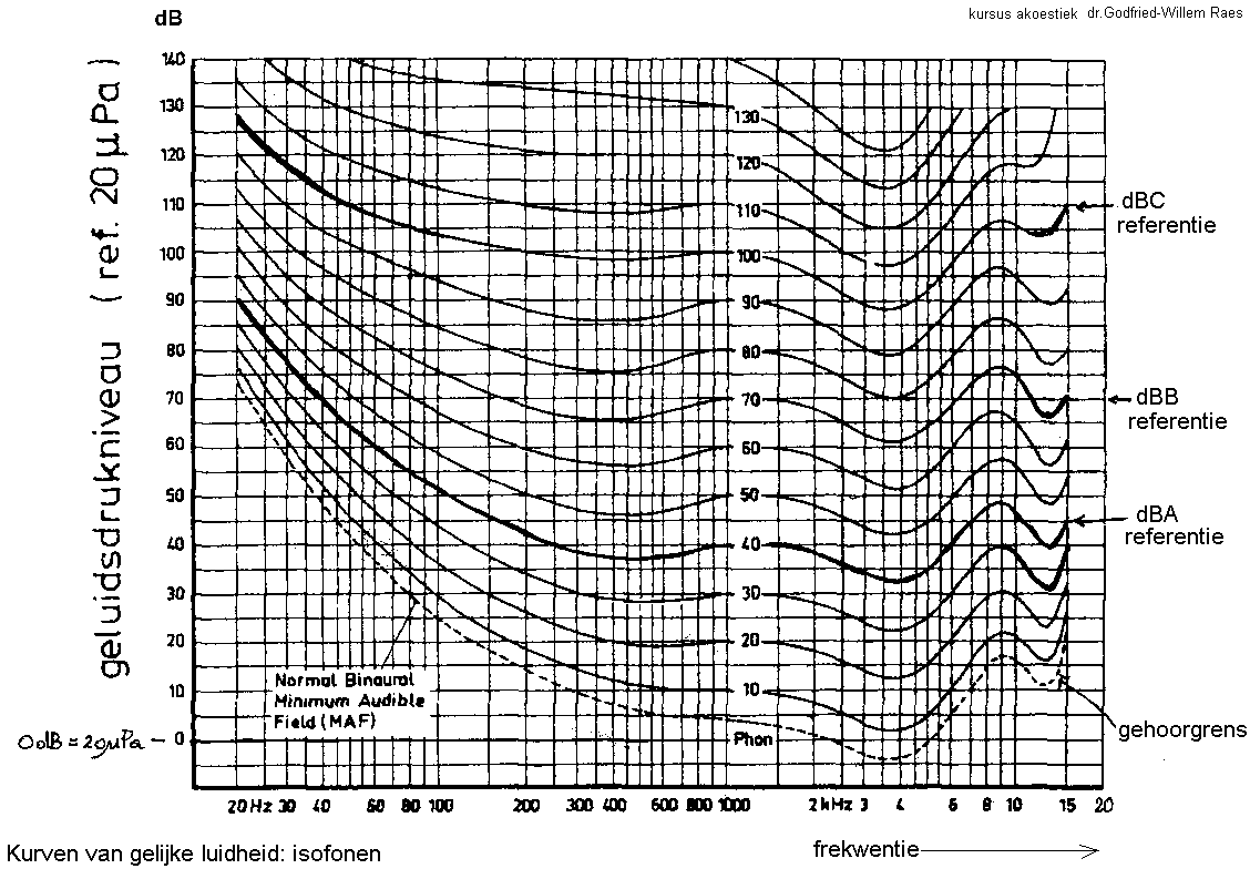 Talloze onderzoekers hebben zich minutieus beziggehouden met het gedetailleerd in kaart brengen van de eigenschappen van het menselijk gehoor. De eerste isofoonlijnen (kurves van waargenomen gelijke luidheid in funktie van frekwentie) werden opgesteld door Fletcher en Munson. Later werden die door Robinson en Dadson met heel wat meer proefperonen verbeterd en genormaliseerd tot de hieronderafgedrukte standaard kurven, geldig voor sinustonen: