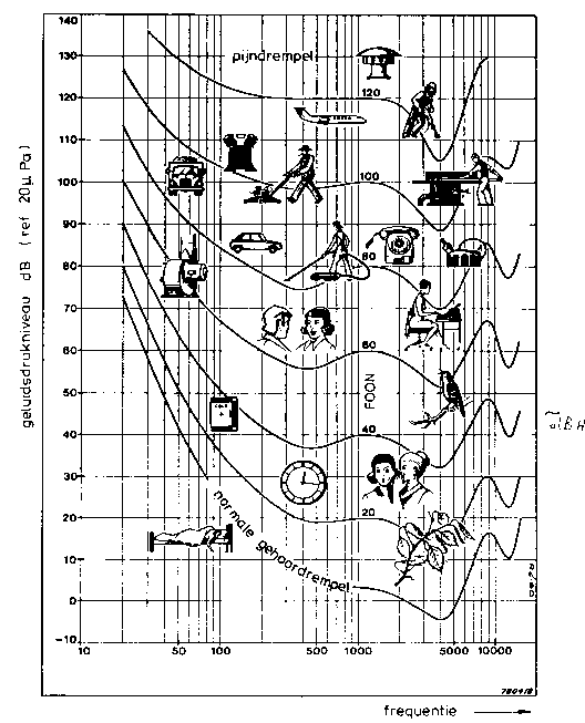 b. aan de bovenste grens wordt onze waarneming beperkt door wat men de pijngrens heeft genoemd. Daarboven treedt blijvende gehoorschade op. Maar ook geluid ver onder die pijngrens tast de gevoeligheid van het oor in grote mate aan, al wordt het dan een funktie van de blootstellingsduur. Vandaar de door de wet gehanteerde geluidsnivo grens van 90dBA (zie verder).