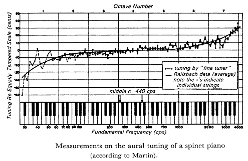 Het is bekend dat pianostemmers de lage noten opzettelijk wat te laag, en de hoge juist wat te hoog stemmen. Voor wat de lage noten betreft heeft dit in eerste plaats te maken met het feit dat de grondtoon en de eerste oktaaftoon helemaal geen oktaaf vormen en de stemmer ervoor zal zorgen dat de eerste oktaaftoon juist staat met het hoger oktaaf, eerder dan de grondtoon zelf juist te stemmen. In dit bereik van de piano wordt dus rekening gehouden met de intrinsieke inharmoniciteit van de snaren zelf (cfr. onze hoofstukken i.v.m. snaren). Voor wat de hoge noten betreft, heeft het daareentegen alles te maken met de niet lineariteit van het menselijk gehoor zelf. Om de toonsafstanden in de hoogte min of meer gelijk te laten klinken, moeten we de objektieve intervallen juist wat groter maken. In onderstaande grafiek is dit duidelijk af te lezen. De meetgegevens werden bekomen door een ervaren pianostemmer een buffetpiano op het gehoor te laten stemmen. Achteraf werd de juiste toonhoogte van elke snaar afzonderlijk elektronisch nagemeten. De dikke zwarte kurve geeft de gemiddelde stemgegevens weer volgens Railsbach.