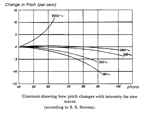 Het menselijk oor blijkt veranderingen van intensiteit in een aantal gevallen eveneens als veranderingen in de toonhoogte waar te nemen. Toonhoogtes in het middengebied van 1000Hz tot 2000Hz worden het minst 'ontstemd' onder invloed van de geluidsdruk. Toonhoogtes daarboven worden hoger waargenomen naarmate ze luider worden aangeboden. Toonhoogtes onder dit gebied evenwel, worden lager waargenomen wanneer ze luider worden. (Onderzoek van S.S.Stevens, "On de Validity of Loudness Scale", in: Journal of the acoustical society of America, 31:059-1003, 1959).