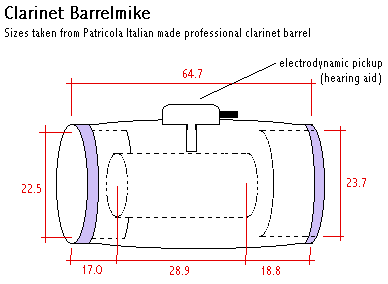 PS: a pure acoustic amplifier for the clarinet can be build by boring a slightly larger hole in the barrel and placing a kazoo like mechanism on it (replacing the microphone capsule in the drawing above). The sound level becomes tremenduous...