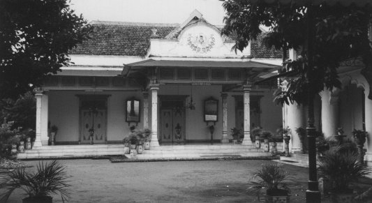 De voorbereidingen voor ons koncert in Yogyakarta rollen van een leien dakje. Mijn vrees dat het Bandung-incident hier roet in het eten zou komen strooien, blijkt gelukkig uit de lucht gegrepen. Yogyakarta, ontpopt zich als de vredelievendheid zelve. Toen er in november overal op Java rellen en opstanden tegen de Chinezen uitbraken en ook de Chinese wijk van Yogyakarta dreigde in de vlammen op te zullen gaan, was de sultan op het spreekgestoelte geklommen en had hij de bevolking weten te overtuigen af te zien van irrationeel geweld en pseudo wraakneming tegen het Chinese deel van de bevolking. Hij was zelfs zover gegaan om een studentendemonstratie om te toveren tot een heuse vredesbetoging met meer dan tienduizend deelnemers, waarvan hij zelf op kop was gaan lopen. In zijn Kraton-paleis zijn ook niet voor niets op de ballustrades de symbolen van de verschillende religies van Indonesië terug te vinden, hoewel hijzelf een Islamitisch heerser is. Hij had in zijn toespraak gewezen op de aloude traditie van Yogyakarta, zich te manifesteren als de vredelievende regio bij uitstek en had de opstandige bevolking en vooral de studenten gevraagd, wat voor toekomst zij feitelijk wilden. Een toekomst aansluitend bij die vredestraditie dan wel een nieuwe weg gebaseerd op wraak en geweld. Hij was in zijn opzet geslaagd en had zo de stad van vernieling en plundering gevrijwaard. ![]() Ook het cultureel centrum waar we vanavond zullen optreden, ademt rust en tolerantie uit. Hoe verschillend is de sfeer hier van de haast kolonialistische atmosfeer die we in Bandung hebben geproefd.