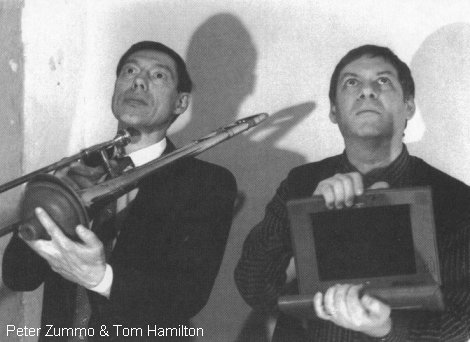 Het is nu vier of vijf maanden dat ik voor het eerst de lokalen van Logos binnentrad. Via beelden en metaforen trachtte ik deze toen voor mij ontoegankelijke muziek in het mate van het mogelijke zin te geven. Toch bestaat er, voor zover ik weet, een wezenlijk verschil tussen muziek en beelden. Tijdens OFF-HOUR WAIT STATE, eerste dag van The International Zummo/Hamilton 2000 conference, werd ik doorheen de muziek, maar ook de beelden bewust van dit feit. Het concept van deze opvoering staaft namelijk op beelden, waardoor ik geen metafoor moest uitpluizen om deze muziek in kaart te brengen. Een andere invalshoek dringt zich op, waarbij de relatie tussen muziek en beelden dient onderzocht te worden. We hadden dat eigenlijk al meegemaakt tijdens de engelenzangen van Thomas Beimel, alhoewel er toen een metafysische wereld werd geschapen. Vandaag treedt een heel alledaagse wereld naar voren, de wereld van de subway, de ondergrondse. Een vraag stelt zich meteen bij een dergelijke evocatie: zal de muziek zich toespitsen op het ondergronds karakter of op de menselijke activiteit in deze context? Beide vormen misschien de kern van de zaak, de mens concipieerde onbewust een artillerie van geluiden die wij nu als ondergronds bestempelen. Het is ook treffend hoe de geluiden van de naderende metro gelijkenissen vertonen met het splijtend en kreunend geluid van bewegingen binnen de aardkorst. Het tsjilpend begin van Hamilton's analoge synthesizer is slechts een introductie, het ruisen van de sporen, het geknetter van elektriciteit en de donkere oertonen van een enorme luchtverplaatsing zijn daarentegen de openbaring van een ondergrondse beweging of de dagelijkse confrontatie van duizenden mensen met de oorsprong van het leven zelve. Deze dagelijkse kost wordt nu in al haar naaktheid weergegeven. Maar om het beeld van de realiteit niet te vertekenen, betreden de muzikanten deze omgeving als de enkeling die zich in een krioelende massa mengt, nog denkend aan de droom die deze nacht zijn geest achtervolgde. Ieder voor zich, duizenden individuen met een eigen geschiedenis, allen hebben desondanks hetzelfde momentane doel: zo vlug mogelijk weg zijn. In de verte klinkt de opzwepende toeter van de metro (nu vertolkt door de trombone). Gitarist, trombonist verschijnen nonchalant ten tonele en zetten zich een beetje vertwijfeld op een klapstoel. De fluitiste kondigt achter het publiek nog meer beweging aan terwijl de grillen van de slagwerker de volgende trein inluiden. Het geheel evenals de beweging (letterlijk) tussen de muzikanten, intensifieert zich. De fluit imiteert het geblaas van de machine, het gekreun van de remmen wordt door de trombone weergegeven. Het beeld van de trein is nu perfect zichtbaar, maar vreemd genoeg verschijnt er slechts een contrabas op de scène. Even heerst een bedreigende stilte, voor de motoren, door de contrabas, geactiveerd worden. De trombone blaast weer leven in de machine en dit stimuleert op zijn beurt een komen en gaan van de mensen. De sfeer degenereert plotseling naar een chaos van kreten alsof enorme krachten tevergeefs weerstand bieden aan deze geforceerde beweging. We treffen hier een tweede gezichtspunt van de muzikale illustratie, m.n. de beschrijving van krachten die een dimensie, eigen aan de machine, opwekken. Een ritmische structuur komt ongecontroleerd tevoorschijn, zoals verschillende onderdelen in een machine toevalligerwijs af en toe hun bewegingen lijken te synchroniseren. Toeval is het eigenlijk ook niet, hun verschillende cyclussen moeten logisch gezien op een bepaald punt overeenstemmen zoals de maan de zon om de zoveel tijd eens overschaduwt. Het baart de muzikanten in ieder geval geen zorgen, de toeschouwers evenmin. Alles verloopt in zo een diepe transcendente sfeer dat enige concentratie op het spel nauwelijks houdbaar is. Een universum van geluiden om zich in te verliezen. Eigenlijk helemaal dezelfde verwarring die je 's ochtends beleeft als je op de metro staat te wachten met deze uitzondering dat deze sfeer nu toeslaat in een omgeving waar ze niet thuishoort. Ik realiseer dat het luisteren van het heen en weer rijden van treinen best relaxerend kan zijn. Tom Hamilton is de enige die blijk geeft van een ander soort trance, ik noem ze de coördinerende trance. Met zijn handen bediend hij vele knopjes die, naar mijn vermoeden, vele functies bezitten en de toekomstige walm van geluiden gaan genereren. Hij bezit de structuur van de uitvoering in handen en bepaald zo de vaart en de richting van trein waarin we ons bevinden. Grappig genoeg zit hij voor zijn synthesizer alsof hij de bestuurder van de machine was.