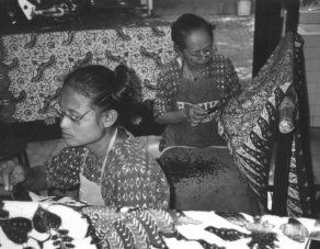 Het wordt een heel tof en vooral ook leerzaam bezoek. Vrouwen van alle leeftijden werken met een engelengeduld onverstoorbaar verder aan de meest ingewikkelde motieven. Het maakt hen niets uit of we op hun vingers staan kijken of niet. Met een koperen werktuigje, uitgerust met een fijne gietteut, wordt een uit bijenwaslijntjes opgebouwd motief getekend. Na ieder kleurbad komt er een nieuw lijnenweb bij. De werksters dragen een lederen schort, waar ze om te streep even hun was over afstrijken. Hun schorten zien eruit als schitterende hedendaagse kunstwerken. Mocht Joseph Beuys dat hebben gezien…