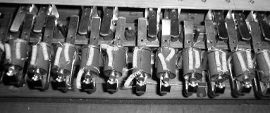 Hartafstand tussen de bedieningspallen voor de rieten was 13.54mm, waardoor we de magneten om en om (in twee rijen) dienden te monteren. Wanneer we de bedieningsmagneten om en om monteren, mogen ze hooguit 27mm breed zijn. De gebruikte types zijn 20mm breed. Voor deze montage bouwden we twee lijsten uit vierkant staalprofiel 16x16. Hierop worden de elektromagneten met parkerschroeven vastgezet en uitgelijnd.