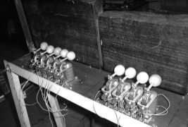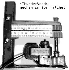 A ratchet , controlled by a synchronuous AC motor with speed reduction mechanism makes the cracling wood sounds in this instrument. As can be seen from the picture, the wood tongues are taken from an old metric size.