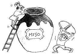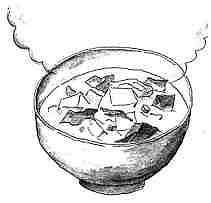 De Otogikan vergast ons op een uitstekend ontbijt, hoewel hier, zoals tijdens onze vorige twee koncertreizen, opnieuw honderd procent traditioneel Japans. Gedaan met de toastjes en westerse jam, zoals bij Kumi en Professor Yu thuis. Hier in Kawamoto is het eten 'gewoon' - dus niet chique "à la Europa' - en dat betekent niets minder dan geurige zeewiermiso soep in een lakwerk potje voorzien van idem dito deksel. Daarna witte kleefrijst, ook al met een deksel warm gehouden, in een porseleinen kom. Gepekelde gember en groeten, respektievelijk in een minuskuul vierhoekig schaaltje met bladvormig geplooide hoeken en op een ondiepe, ovalen schotel uit antracietkleurige korrelige klei gedraaid. Verder nog een potje vol onooglijk kleine visjes, die met hun transparante lijfjes en grote, zwarte ogen je meelijwekkend aanstaren op je nuchtere maag.