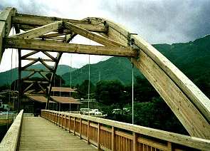 Na de koncertvoorbereidingen rijdt Eiko ons naar onze slaapplaats. Die zal zo ongeveer iedere dag wisselen. Waarom blijft ons een vraag. Tot onze verbazing zullen we de eerste maal overnachten in een soort nieuwgebouwd houten vakantieoord. Een tiental chaletjes, waarvan er nog twee in aanbouw zijn, moet de toeristen herbergen. Toeristen? Hier, temidden van Shikoku? En dat terwijl in de reisgids schaamteloos te lezen staat, dat Shikoku het bezoeken niet waard is, omdat er niets te bekijken valt. Schrijnend, hoe de westerse vakantie-industrie ganse delen van de wereld als niet eens de moeite waard bestempelt. Daar waar het leven nog in zijn oorspronkelijke vorm met zij alledaagse oude tradities zijn gezapig gangetje gaat, daar is niets te zien, oordeelt men, in de plaats van de toerist. En achteraf maar klagen dat diezelfde vakantiegangers zich als een kudde schapen gedragen. Maar Awa Ikeda heeft, ondanks de vele vooroordelen, grootse plannen. Ja hoor, er is zelfs een heus toeristisch informatiecentrum gebouwd, naast een betonnen waterval, waar vroeger een klein bergriviertje vrolijk in alle vrijheid voortkabbelde. Over het getemde water is een opzichtige houten brug gebouwd. Het centrum zelf oogt opvallend groot en paalt aan een bescheiden shoppingmall. De vloer van het toeristenkantoor blijkt een in keramiek uitgevoerde landkaart van het ganse eiland te zijn. Talrijke plaatselijke Japanners staan er zich aan te vergapen. Er zijn zelfs lampjes ingebouwd en het valt onmiddellijk op hoeveel groen er hier nog is. De stadjes ogen onnoemelijk klein temidden van de bergketens die zich samen met de rivieren als slingerende stekels van een grote draak heen en weer kronkelen.