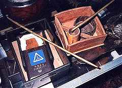 We laten onze schaarse bagage achter - de instrumenten zijn in de koncertzaal gebleven, dus veel meer dan een toiletzakje en een fotoapparaat hebben we niet mee - en rijden terug naar de stad. Eiko wil ons enkele musea laten zien, maar er is slechts eentje open vandaag. Nu ja, museum is hier een groot woord. We maken hier kennis met het fenomeen in zijn meest oorspronkelijke vorm. De een of de andere bewoner toont eenvoudigweg zijn of haar kollektie oude spullen, maar dat is dan wel heel wat. Japanners zijn tuk op antikwiteiten en zo'n verzameling straalt zo'n charmante ongekunsteldheid uit, dat je hoe dan ook op slag vertederd wordt. De eigenaar staat er vanzelfsprekend glunderend bij en zal je bij iedere vraag overstelpen met wetenswaardigheden, zodat je je entoesiasme wel moet doseren. Anders raak je er binnen de drie - wat zeg ik - tien uur nog niet buiten. Wat een interessante objekten leren we hier niet kennen. De reuze sakekruik, die onderaan is uitgerust met een houten tap en de houten blokschoenen of geta, zoals ze al door de eeuwen heen de tijd trotseren. Ook de 'one puff pipe' met zijn koperen kopje en een prachtig houten draagkoffertje voor asbak en tabak, ontbreken niet. Stapels kalligrafieen en oude geschriften. Lakwerk kommetjes en huwelijksschotels in rood en goudkleur uitgevoerd. Keramieken hoofdkussens met wierookbranders in… je kan het zo gek niet bedenken.