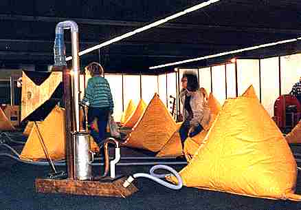 Maandenlang is onze kostume-ontwerpster Carla Bracke naarstig aan de slag geweest, om nieuwe pneumafoonkussens te maken. Na een intensieve zoektocht kon zij het meest geschikte, knalgele zeil voor de opblaasbare zitkussens op de kop tikken. De patronen werden uitgetekend en lijm en naaigaren aangeschaft. Weldra werd onze vroegere, kleine koncertzaal in de Kongostraat omgetoverd tot heus naai-atelier en konden we Carla geduldig en vol doorzettingsvermogen zien zwoegen met het weerspannige zeil. Ondertussen heeft ze zo niet alleen de ganse voorraad kussens vernieuwd, maar heeft ze ook een heel stel reservekussens klaar. Wij houden er aan, haar ook via deze weg nog eens extra te bedanken voor haar entoesiaste medewerking.
