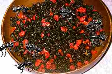Maar binnenshuis wacht ons nog een andere verrassing. Als achteloze beginnende vruchtenplukkers waanden we ons alleen op de aardbol en hadden niet door dat wij, mensen, vanzelfsprekend niet de enige wezens zijn die van een moeizaam bijeengesprokkelde oogst willen leven. Groot is dan ook onze verbijstering wanneer we een dikke, zwarte kolonne miertjes ijverig op en af zien trekken vanuit een reet tussen twee tegels, over het vloerkleed via de keukenkastdeur, over het elektrisch fornuis tot helemaal in onze kom frambozen. Ik slaak een kreet en Godfried, die is achtergebleven en blijkbaar nog steeds op slangenjacht is, komt aangehold. Wassen en nog eens wassen is de enige oplossing. Na een zevental keer overvloedig spoelen hebben we een paar honderd moorden op ons geweten en sluiten we de bessen veilig op in de ijskast. Voila, zo hebben we weer eens een lesje geleerd.