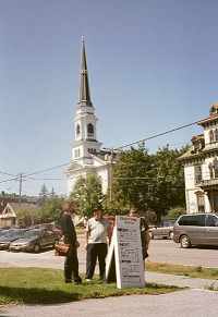 Toch een bizarre toestand dat "Ought One"Festival hier in Vermont. Om de een of andere, mij vrij duistere reden, is een tweetal maand voor de start van het gebeuren, het ganse opzet met hebben en houden uit de stad waar het oorspronkelijk was gepland, gebannen. Nochtans was het tweejaarlijks muziekevenement daar kennelijk reeds heel lang gehuisvest. Charlie had ons het stadje, dat pal op de Canadese grens ligt, getoond en het zag er als alle plekken in Vermont heel vriendelijk en gastvrij uit. Wat de juiste toedracht van het hele verhaal dan ook is, blijft een tikkeltje mysterieus. Nu, waarom zou ik dat willen ophelderen? Het maakt zo'n verhaal alleen maar opwindender, dus waarom gaan grasduinen.