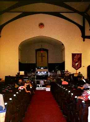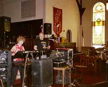 Nu, de kerktoren buiten had er alvast niet om gelogen. Een glas-met-lood-deur wordt kriepend geopend. En daar staan we: temidden van twee rijen kerkbanken in een "fake" gotische kathedraal die alle normen van goede smaak tart. Pseudo glasramen, waar ze behoren te zitten, en een al te groot houten kruis bungelend boven een onzichtbaar altaar, bedolven onder tonnen elektronika en muziekinstrumenten.