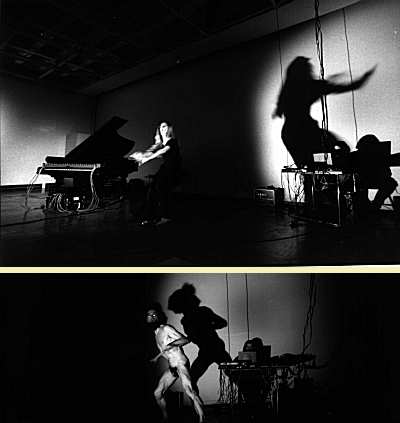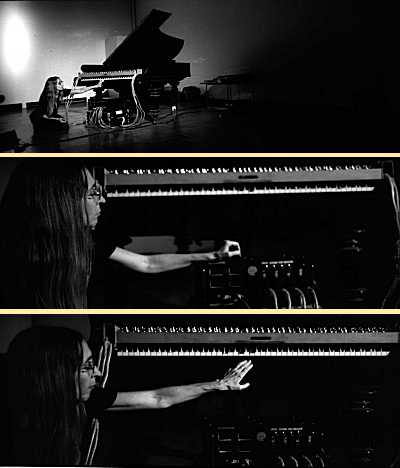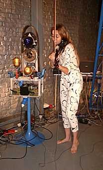 Links: Moniek performt haar nieuwste interaktieve kompositie "Robot Garden"