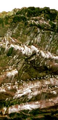 Daarna leer ik het onderscheid tussen "murres", de pinguinachtige vogels die eenenkel scherpgepunt ei leggen, zodat het niet naar beneden kan rollen, de "common murres" en de "thick billed murres", de witte "gannets", de zwarte "cormorants" en de "guillemots die overwegend zwart zijn met een witte vlek.