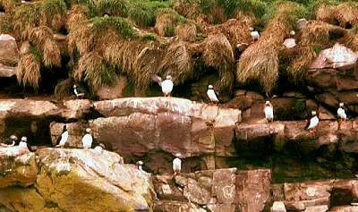 Hup, daar knarsen de motoren weer. Gull Island wordt snel opnieuw het groengestreepte witte eiland aan de einder. De golven klotsen rustig tegen de boegen op. Gelukkig is het helder weer en de wind niet al te guur. Stilletjes zit ik te bedenken, hoe je beleefd een taterende gids de mond kan snoeren. Diverse scenarios spelen zich in mijn gedachten af, maar veel tijd tot overleg heb ik niet, want daar doemen de langverwachte papagaaiduikertjes reeds met honderden tegelijk in de lucht op.