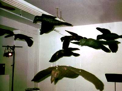 Terug op de kade in St.John's worden we uit de bus geladen bij een "indoor installation", afgestemd op ons zeeavontuur. "The Blackbird Project" is van de hand van Helen Gregory en heeft zowel een visueel als een audio luik. Tegen het plafond zijn zwarte, papier mache zeemeeuwen met ingebouwde schelpen, kreeftenpoten en dergelijke meer, opgehangen. Komponist Sean Ferguson zorgde voor een kraaien-soundscape en live fluitist Kate Herzberg beweegt al spelend doorheen de ruimte. Het publiek schuift zachtjes onder de donkere vogels door. Hier en daar zitten luisteraars genietend op de grond tegen een paal of muur geleund, starend in de hoogte. De buiken van de zwartpapieren vogels dragen het leven van de zee in zich. Ook de muziek en de vogelgeluiden vloeien naadloos in elkaar over. Het geheel vind ik indrukwekkend mooi en vertel het de auteurs, die zichbaar glunderen.