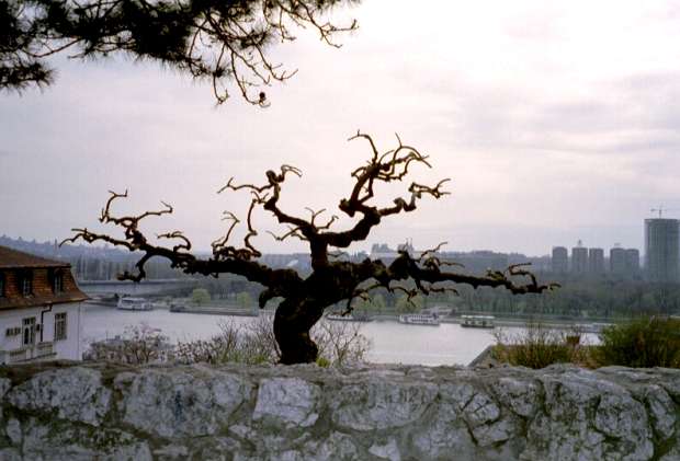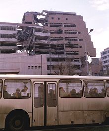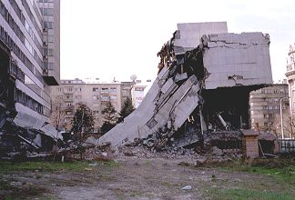 Wanneer we tijdens onze anderhalve vrije dag langs die misdaadsite wandelen, beginnen mijn knieën weer te daveren, deze keer niet van de toch wel hilarisch uitgedoste amerikanen, maar van de lugubere aanblik van de gebombardeerde gebouwen van de hoofdkwartieren van Milosevic. Niets is heropgebouwd. Je kan zo de inslag van de bommen en het afgelegde trajekt ervan volgen. Ik sta aan de grond genageld. Geen tv hebbende ben ik dit soort beelden enkel van de krant gewoon en derhalve nog niet immuun voor de volle gruwel van dergelijk geďnstitutionaliseerd geweld. Ik maak gegeneerd enkele foto's, denkend aan dit artikel, maar de kiekjes lijken ook weer zo ontdaan van alle onmenselijkheid die de met opzet door mensen aangerichte ruines in realiteit eigen is.