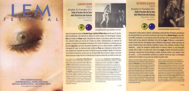 Op zaterdag 25 oktober 2003 is het Logos Duo (Godfried-Willem Raes en Moniek Darge) tenslotte uitgenodigd tot deelname aan het L.E.M.-Festival te Barcelona.
