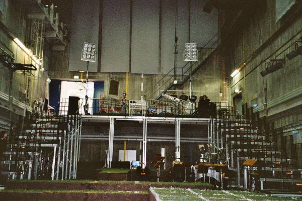 Al snel wordt nu evenwel duidelijk, dat de toch wel imposante grootte van het robotorkest flink is onderschat. Mede omwille van de uitgebreide operacast: zangers, akteurs, dansers, performers, orkest en dirigent, is er een te krappe plek voor voorzien. In de toch wel zeer grote "Reaktor Halle" is voor de kombinate van én Logos'machines én <M&M> Ensemble onvoldoende plaats.. We beslissen dan maar, om al de automaten boven op een van de hoge podia te plaatsen en de radar modules die de bewegingsruimte afbakenen, beneden op te stellen. Deze positionering mag dan als voordeel hebben dat de robots hoog boven het gebeuren uittorenen, wat een imposante indruk maakt, maar er is wel één groot nadeel: Kristof die boven achter de centale komputer zal plaats nemen, kan onmogelijk oogkontakt leggen met Godfried-Willem Raes en Moniek Darge die beneden voor het interaktief spektakel zorgen. Maar gelukkig vinden we ook daar een oplossing voor: Bert zorgt voor koördinatie door live signalisatie! En zo geraken we toch tijdig met de ganse opstelling voor de repetitie klaar.