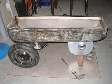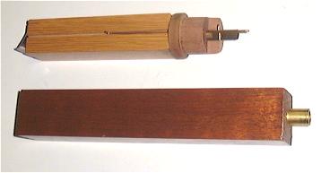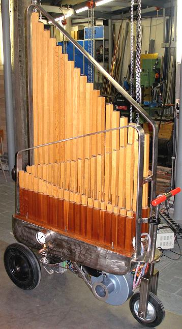 Voor de bouw van deze automaat maakten we gebruik van een eerder toevallige aanbieding op de website van August Laukhuff, voor een volledig in hout gebouwd 8-voet kromhoorn orgelregister. Een tongwerk dus. Dit loopt vanaf midi noot 36 tot en met 91. De windlade is, afgezien van het bovenblad waarop de pijpen rusten en waarvoor tropisch hardhout werd gebruikt, geheel vervaardigd uit gelast inox. Geheel naar analogie trouwens met de windlade zoals we die eerder al ontwierpen voor <Trump>. De elektromagnetische ventielen waarmee de luchttoevoer naar de pijpen wordt geschakeld zijn ook hier binnenin deze windlade geplaatst. Voor de windvoorziening maakten we gebruik van een kleine Ventus orgelblazer van de firma Laukhuff, met een regelbare winddruk van maximaal 80mm waterkolom, of 8mBar = 785 Pa, in eenheden uit de fysika. De aansturing van de 130Watt motor gebeurt met een motorcontroller. Zoals voorspelbaar en normaal bij tongwerken, is ook hier de stemming afhankelijk van de winddruk. Alleen bij een motor AC frekwentie van 48Hz is de stemming korrekt. Winddruk 75mm H2O. Om een eenvoudige afregeling, stemming en intonering mogelijk te maken, monteerden we een precieze manometer aan de buitenkant van de windlade. Het maximale debiet van de kompressor is 3 kubieke meter, wat dus brede klusters ruimschoots mogelijk maakt.
