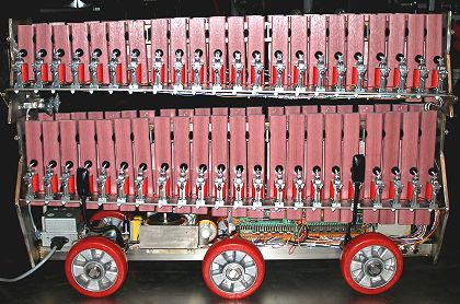 Voor de klankstaven gebruikten we sintetisch glasvezelversterkt materiaal, geleverd onder de merknaam 'Vibercore' door Vancore in Nederland. Dit materiaal geeft een wat harder maar ook naar toonhoogte stabieler resultaat dan de gebruikelijke tropische houtsoorten. Anders dan bij de tegenwoordig gebruikelijke orkest xylofoons verzaakten we heel bewust aan het monteren van buisrezonatoren onder de laagste klankstaven. Op die wijze blijven we dichter bij het historisch klankbeeld, waarin uitgerekend het non-harmonische van de klank voorop staat. Vergeten we niet dat de xylofoon in de muziek simbool stond voor de dood (gerammel van skeletten, zoals beschreven door Sebastian Virdung en Arnold Schlick in 1511 waar die het heeft over de Hultze Glechter, en mid 17e eeuw door Marin Mersenne) en dat die voor de tweede helft van de 20e eeuw nooit met resonatoren werd gebouwd. Voor de schikking van de latten verzaakten we ook aan de traditionele (en eigenlijk uit ergonomisch en speeltechnisch opzicht volslagen idiote) rangschikking van de staven volgens het pianoklavier. We schikten de staven zo dat de ene kant van het instrument de 'gewone' tonen speelt en de andere de kwarttonen. Aangezien de latten het geluid langs beide zijden projekteren, levert dit -anders dan bij ons kwarttoonsorgel <Qt>- geen noemenswaardige balansproblemen op. Elke kant is opgebouwd uit twee bovenelkaar opgestelde vertikale rijen van 22 klankstaven. De klankstaven werden opgehangen op hun nodale punten. Op deze wijze kon het instrument bijzonder kompakt worden gebouwd. De robot kan zowel op het voorziene wielstel op de grond worden geplaatst als opgehangen aan de daarvoor voorziene haken. In dit laatste geval moet de konstruktie van de zoldering natuurlijk wel voorzien zijn van een takel en uiteraard voldoende draagkrachtig. In gebruikelijke teaterzalen stelt dit zelden problemen. Het wielstel bestaat uit zes wielen van 160mm doorsnede, waarbij het middelste wielkoppel 5mm lager is gemonteerd dan de andere wielassen. Hierdoor is zonder gebruikmaking van een kruisdissel, toch een goede wend- en verplaatsbaarheid gegarandeerd. De knalrode banden zijn vervaardigd uit massief polyurethaan met een hoge densiteit en een uitstekende veerkracht. De wielen zelf zijn voorzien van degelijke kogellagers.