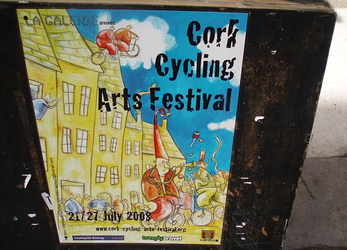 Logos' Zingende Fietsensymfonie uitgevoerd in Zuid - Ierland.![]() Garrett van de “Community Bikes” van Cork is onze Zingende Fietsen op het spoor gekomen via het internet. Voor het eerst zal er een "Cycling Arts Festival" gehouden worden in het Zuid - Ierse Cork en de diverse organisatoren zijn op zoek naar kunstenaars voor wie ook fietsen kreatief kan worden ingevuld. Zodra Garrett ons mailt met een uiteenzetting van zijn plan en met de vraag of hij De Zingende Fietsensymfonie mag laten uitvoeren in Cork, popel ik om naar Ierland te kunnen gaan. Dit land prijkt immers nog niet op de Logos' wereldkaart en zal meteen het dertigste land zijn waar we een Logos projekt zullen uitvoeren. Ik mail Garrett terug met een vage suggestie dat we zelf zouden kunnen komen participeren en Garrett reageert meteen zeer positief op ons voorstel. Dus, zo gezegd (of beter: zo geschreven), zo gedaan. De reiskosten vallen alvast goed mee want Ryanair heeft een aanbieding Charleroi - Dublin voor 0 euro (exclusief luchthaven - en kerozinetaksen enz.) waar een gewone luchtvaartmaatschappij voor Brussel - Cork liefst 500 euro vraagt. Aanvankelijk bood Garrett aan dat we bij hem thuis zouden logeren, maar uiteindelijk opteren we toch voor een relatief bescheiden hotel weliswaar met sauna en Turks bad. Kati Couck, die als vrijwilligster werkt voor Stichting Logos, zal me naar Cork vergezellen. Een intensieve mailkorrespondentie ontwikkelt zich tussen Garrett en mij mbt. alle aspekten van de Zingende Fietsen en de Zingende Fietsensymfonie: het type luidsprekers, de dynamo’s, de buizen en de kostuums. Echt alles passeert de revue. Uiteindelijk is het zover: we kunnen vertrekken. Opstaan om 3u30 's nachts om op zomerse werkreis te vertrekken naar een regenland...eventjes denk ik: “we zijn niet wel wijs", maar nu is er geen terugkrabbelen mogelijk, dus vooruit met de geit. Kati is zo lief om ons op dit ondeftig vroege uur naar Charleroi te voeren en de GPS verbreekt de stilte van de nacht. Na iets meer dan een uur rijden staan we voor de oude luchthaventerminal, die gesloten blijkt te zijn. Pas na wat rondrijden vinden we de nieuwe terminal en parkeren we de auto in de overdekte garage, alwaar Kati's dochter, Lisa, de wagen later zal komen ophalen. Uit een automaat halen we zelf onze “boarding passes”, wat ons een hoop aanschuiven bespaart en kunnen we onze bagage inchecken. De vrouw aan de balie wijst er ons op, dat Kati's naam op haar identiteitskaart wel Catharina is en niet Kati en dat dit de volgende maal niet meer gebeuren mag. Ik excuseer me omdat ik de boeking maakte en klaar is kees: onze bagage verdwijnt via de band de diepte in.
