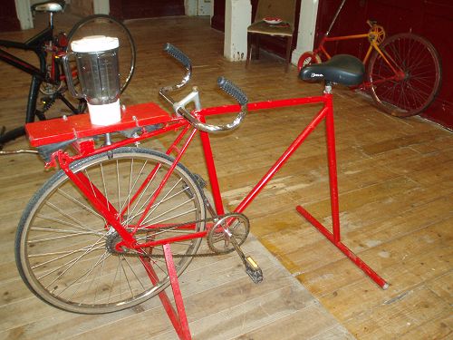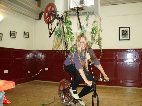 ![]() “Top of the bill” zijn evenwel de drie fietsen waarop je kunt plaatsnemen en pedaleren, met hilarische effekten als resultaat. Op één vehikel is waarachtig een fruitmixer gemonteerd en al trappend kan je zelf je sinaasappelsap bereiden. Bij een tweede fiets moet je heel hard ter plekke gaan rennen, eer er wat muziek uit een aftandse ghettoblaster loeit en bij de derde fiets begint een parapluskelet vol groene takken heftig rond te draaien en waarachtig bladeren in je gezicht te slaan. Hilarisch.