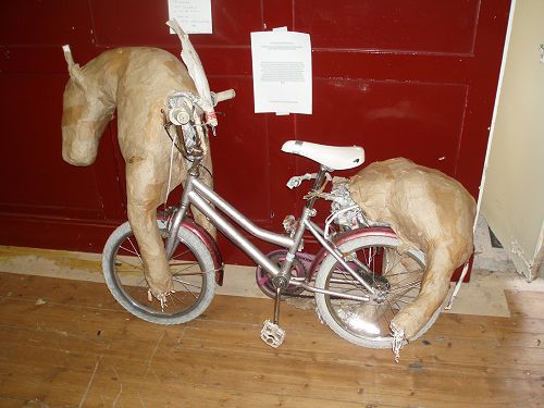 Logos' Zingende Fietsensymfonie uitgevoerd in Zuid - Ierland. (deel 3 - slot)De volgende morgen bezoeken we eerst de tentoonstelling van het Fietsenfestival. De lokatie is wel opmerkelijk. Een klein, oud kerkgebouwtje temidden van een drukke winkelstraat. Een hek sluit de inham die naar de toegangspoort leidt af. Links en rechts van het pad staan wat struiken en bloemen. Het zou Ierland niet zijn, zonder groen. De tentoonstelling is grappiger dan ik had verwacht. Aan de muren veel karikaturen van fietsen allerhande en een reeks mooie tekeningen van de Franse kunstenares Delphine Arnault. Eentje ervan met een kabouterachtig figuurtje op een fiets temidden van kromgetrokken gebouwen, is gebruikt voor het affiche van het festival. Maar de driedimensionele objekten zijn de echte blikvangers. Een groot roestig vehikel toont nog iets van de vormen van een erg overmaatse fiets. Spijtig dat er evenwel niets aan kan bewegen. Dan is er een familie platgewalste fietsen die met kettingen aan elkaar hangen alsof ze een rij Indische olifantjes zijn. Mama - fiets voorop, dan een reeks kindjes en de rij wordt keurig afgesloten door papa - fiets. “Griezelig”, vindt Kati. Precies of ze allemaal platgereden zijn, maar zo zag ik het helemaal niet. Voor mij heeft het groepje een uitgesproken humoristisch karakter.