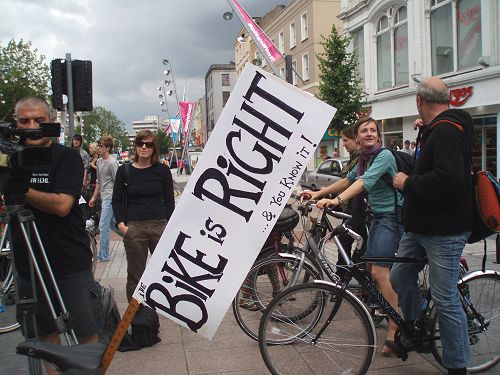 ![]() ![]() In de late namiddag is een “mass critical manifestation” gepland. Waar ik zo’n paar duizend fietsen had verwacht, komen er maar een kleine honderd, misschien zelfs maar vijftig opdagen. Nu pas wordt het ons duidelijk hoe de vork in de steel zit hier in Cork. Terwijl iedereen nog op het voetpad aan het verzamelen is, zijn er af en toe auto’s met jongeren die waarachtig vertragen en iedereen de huid volschelden. Fietsers zijn hier blijkbaar echt niet graag gezien. Enkele bestuurders steken zelfs dreigend hun vuist in de hoogte. Wie had dat gedacht. Waar wij in België fietsen als de normaalste zaak ter wereld beschouwen, moeten de Ieren er hier zelfs nog voor opkomen. “Bike is Right” staat er op één van de zelf geschilderde protestborden te lezen en nu besef ik waarom. Daar is ook Garrett. Hij rijdt waarachtig op de Zingende Fiets. “Kwestie van wat publiciteit te maken voor morgen”, merkt hij lachend op. “Ja, we moeten hier nog vechten voor onze rechten als fietser”, voegt hij eraan toe. “Wel even anders dan in Nederland of België, he.”