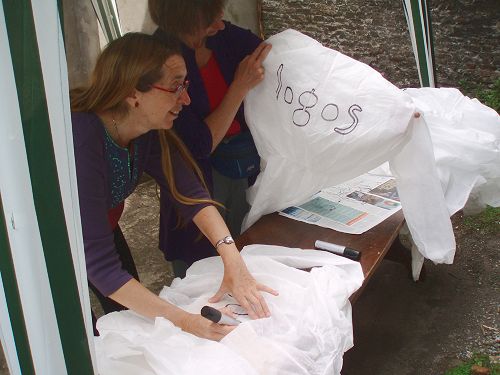 ![]() Veel fietsers dragen fluorescerende jasjes en helmen. Sommigen hebben nog extra belletjes meegebracht om de aandacht te trekken. Stilaan komt er meer en meer volk toestromen. Eén jongen heeft een zelfgebouwde fiets mee, die meer op een clownsfiets dan op een gewone tweewieler lijkt. Hij heeft geen zadel en een heel hoog stuur boven op een veel te groot voorwiel. Daar zou ik geen rondjes willen op rijden. Garrett spreekt niet meer van de twee extra fietsen die hij ons zou bezorgen en we besluiten er maar wijselijk over te zwijgen. Dan wordt het startsein gegeven en de lange karavaan fietsers zet zich in beweging. Sommige auto’s klaxonneren woest, maar er zijn zoveel fietsers dat ze toch de ganse straat ongehinderd in beslag kunnen nemen. Dat belooft voor morgen. Hopelijk krijgen we met de Zingende Fietsen Symfonie niet teveel vijandige reakties. De volgende morgen kom ik met popelend hart wakker. Vandaag is het grote ogenblik aangebroken. Kati en ik zijn in onze nopjes en we gaan vlug naar het kerkje toe, waar eerst de workshop om de fietsen te prepareren, plaats zal grijpen. Nog voor er iemand, behalve Angelique, de hoofdorganisator, is toegekomen, gaan Kati en ik aan de slag. We schrijven met een dikke, zwarte stift “logos” op alle witte overals. Het is een prettige karwei die we klaren op twee schragentafels, buiten op de kleine binnenplaats achter de kerk.