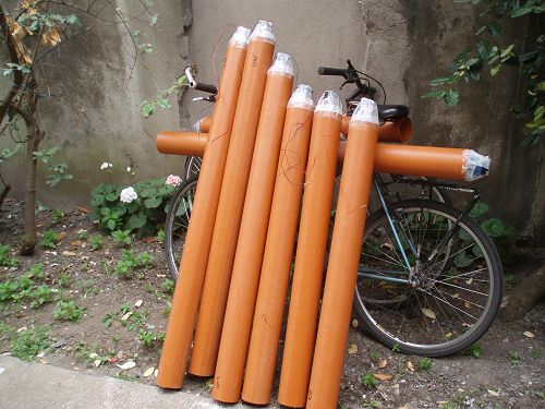 ![]() ![]() Dan komt Garrett toe met de buizen van de Zingende Fietsen. Op het uiteinde van iedere buis is een luidspreker bevestigd. Nu is het zaaks om op iedere fiets een buis te monteren en vervolgens het draadje van de luidspreker aan de dynamo te bevestigen. Vele fietsen – de meeste zelfs – hebben helemaal geen dynamo en gelukkig heeft Garrett hieraan gedacht en er voldoende gekocht zodat we een hele toonladder fietsen kunnen prepareren. Het wordt een vrolijke namiddag vol gelach en plezier. Wanneer eindelijk alle fietsen klaar zijn – en deze maal zijn er wél twee extra voor Kati en mij – houden we een kleine vergadering op de binnenkoer. Garrett stelt ons nog eens voor het oog van de reportagekamera voor en dan vertellen we uitvoerig hoe de Symfonie juist in zijn werk zal gaan. De fietsers vormen een lange rij achter elkaar. De laatste versnelt en haalt de hele groep in. Eens vooraan vertraagt hij weer en zo ontstaat telkens een noot die glissandogewijs naar omhoog en dan weer naar omlaag gaat en boven de cluster van alle zoevende noten uit klinkt. Waar er kasseien zijn is er automatisch vibrato en waar de straatjes heel nauw zijn, komt een spontane galm tot stand.