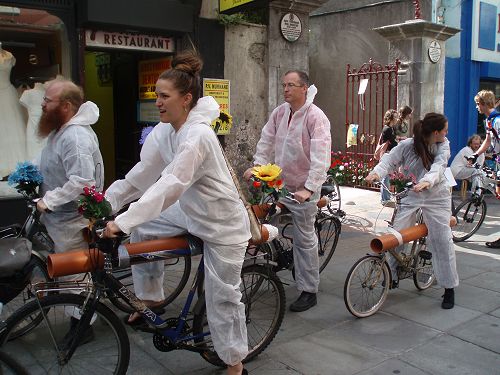 ![]() We hullen ons in de witte overals en iedereen staat te trappelen van ongeduld om te kunnen vertrekken. Het grote moment is aangebroken. Ik bel Godfried, die in Gent is gebleven, nog even vlug op om hem het startsein mee te laten beleven. Nu mis ik hem toch wel echt. Maar veel tijd om te treuren is er niet. Hier gaan we als een pijl uit een boog zoevend de winkelwandelstraat door en belanden temidden van het verkeer aan de linkerkant van de baan. Wat een vreemd gevoel om links te rijden, maar gelukkig went het vlug. We halen telkens weer de groep in en rijden vele rondjes heen en weer. Geen enkele agressieve reaktie vandaag. Alleen maar verbaasde en lachende gezichten. Hoe vrolijk zien die versierde fietsen er ook niet uit en zo grappig met al die zoevende klanken. Wanneer we aan de rand van het oude Cork zijn gekomen, rijd ik toevallig op kop en vraag één van de Ieren waarheen de tocht nu gaat. “Now straight on”, wordt er gezegd en o wee, eens voorbij de Lee begint een gigantische klim. Net wanneer ik denk, dit haal ik nooit tot boven en dus maar beslis om het stilletjes op te geven, draait de groep naar rechts. Ha, die Corkers toch. Ze hadden me beet. Achteraf hoor ik van Kati, dat ze net hetzelfde dacht.