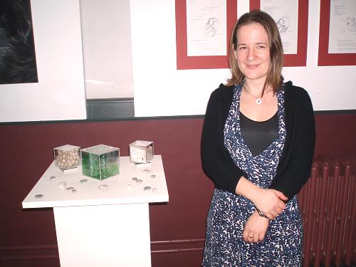 Helen is reeds bezig met het aanbrengen van naambordjes en ik bied aan haar te helpen. Zo kom ik te weten dat de kopjes van de hand zijn van de Canadese Alixandra Bamford en de fles onder de stolp en de blokkendoos door eenzelfde persoon zijn bedacht, nl. door Michelle Detorie uit California, die opgegroeid is in South Carolina. Ik ben heel benieuwd naar de bijdrage van Helen en dat blijken kleine plexiglazen kubussen te zijn met nu eens folies in met tekst op, dan weer plakbandbolletjes met letters. Hier en daar zijn doorkijkopeningen aangebracht afgeboord met een ster rode of gouden draad. Tussen de dozen liggen kleine keitjes met teksten op. Het geheel ademt tegelijk een oeverloos geduld en een grote speelsheid uit.