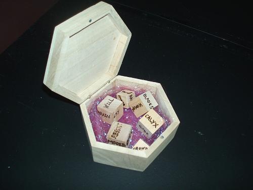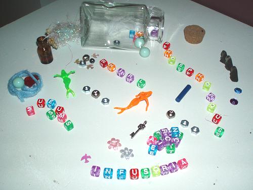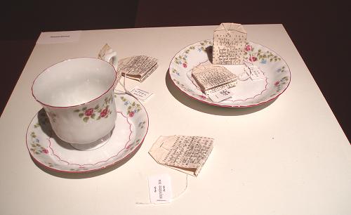 Vanwaar die ongerustheid ontgaat me, want bijna alles lijkt in orde. Ik kan niet nalaten toch even een korte rondgang te maken, om een zicht te krijgen op het geheel. Direkt springen een paar opmerkelijke werken in het oog. Enkele ouderwetse theekopjes met theezakjes waarop tekst is aangebracht, een stolp met een omgevallen flesje waaruit allerhande poppetjes, speelgoedobjekten en dobbelstenen met letters op zijn gerold en een zeskantig houten doosje waarin blokken met letters op een fleurig roos bedje zijn uitgestald. Het hoge speelgehalte van de tentoonstelling valt me bijzonder in de smaak.