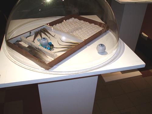 Aan één van de zijwanden is een deur verscholen achter een doorzichtig gordijn waarop met stiksels en kraaltjes boodschappen in morsetekens zijn uitgewerkt. Het is van de hand van Jessica Smith uit Buffalo en draagt de evidente titel Veil. Spijtig genoeg kunnen we de teksten niet lezen, maar ze brengen me mijn vader in herinnering die vroeger avondenlang seinde en ons als kleuter vaak liet meeluisteren naar de geheimzinnige morsekodes uit verre landen. Zou mijn reislust er iets mee te maken hebben? Mijn twee muziekdozen prijken in volle glorie onder hun plexi stolpen. Ik koos voor twee erg vizuele dozen met vele kleurtjes en grappige vormen.
