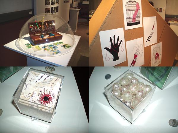 De tentoonstelling heeft een onderkomen gevonden in een klein lokaal, dat een heel originele uitstraling heeft gekregen door enkele reuzengrote kartonnen dozen die op hun smalle zijden middenin de ruimte als een skulptuur zijn opgesteld. Op de zijwanden van die dozen zijn enkele bijdragen gekleefd en rondomrond staan sokkels met driedimensionele werken. Geen internet of video's zoals ik had verwacht. Een medewerker van het Maison des Cultures is druk bezig met het ophangen en richten van de spots en een tweede man loopt zenuwachtig heen en weer met materialen en werktuigen allerhande. Hij maant ons tot spoed aan en is er duidelijk niet gerust in dat we tijdig zullen kunnen openen, want om 15 uur zal hij - klaar of niet klaar - de deuren opengooien.