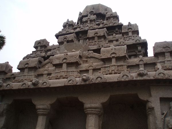 De Zuid-Indische tempelarchitektuur vindt zijn oorsprong in de vele grot- en rotstempels zoals we die kunen zien in Mahabalipuram (het huidige Mamallapuram). De stad was de toenmalige haven van de Pavalla-koningen (6de- 9de eeuw). Nog steeds weerklinken de kappende beitels in ononderbroken ritmes doorheen straten en pleinen, maar nu worden vooral toeristensouvernirs gebeeldhouwd, waar destijds tempels in de rotswanden als geskulpteerde grotten werden uitgekapt. Na deze grottempels kwamen de grote granieten zwerfkeien op het strand aan de beurt om omgevormd te worden tot prototypes van tempels. De vijf Ratha's (ratha=tempelwagen) van Mahaballipuram zijn er een prachtig voorbeeld van. Eentje is gewijd aan Durga, de godin met de leeuw als rijdier. Deze leeuw staat dan ook voor haar tempel opgesteld en houdt er als het ware de wacht. Een grote Nandi-stier, het rijdier voor Shiva, trekt een tweede ratha. Een andere rotstempel is voor Vishnu, en nog eentje voor Surya (god van het zonlicht) en Indra (de heer van de hemel, de oorlog, de regen en de bliksem). Een prachtig realistische olifant houdt hier een oogje in het zeil.