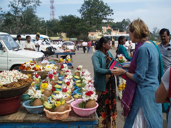 Als resultaat krijgen we bij wijze van zegening een rode, gele of witte stip op ons voorhoofd en de toelating om door te dringen tot het heilige der heiligen. Vaak is het er behoorlijk donker en erg benepen. Het godenbeeld rijkelijk uitgedost met vele bloemenslingers en kostbare gewaden. De penetrante geur van ghee, de geklaarde boter waarmee veel godenbeelden worden ingesmeerd, wringt zich tussen onze neusvleugels naar binnen. Wanneer tegen betaling een puja-ritueel wordt uitgevoerd, slingert de brahman van dienst vervaarlijk met een olievat met grote vlam heen en weer op de schrille klanken van één of meerdere bellen, soms begeleid door indringend tromgeroffel. Met ontbloot bovenlijf en het typische brahmanenkoord over één van de schouders, heft hij een wonderbaarlijk gezang aan, dat zo vaak wordt herhaald tot er een bezwerende en zelfs hypnotische sfeer van uitgaat. Soms vecht ik om niet in trance te raken. Stiekem slaat mijn opnameapparatuur ondertussen alle klanken en geluiden op en heb ik het gevoel dat ik iets sakraals ontvreemd in deze benepen ruimte, waar fotograferen ten strengste verboden is.