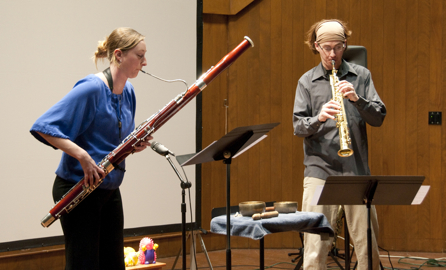 Op dit koncert krijgen we overigens meer dan een oude bekende over de vloer: ongeveer een jaar geleden programmeerden we, vers uit de artscene die Rogers frekwenteert, de saxofonist Michael Strauss en fagottist Dana Jessen. Samen vormen zij sedert 2005 het EAR (Electro-Acoustic Reed) Duo, toegespitst op -naast arrangementen van het werk van Terry Riley, Steve Reich en James Tenney- ook eigentijdse komposities die speciaal voor hun bezetting werden gekoncipieerd. Ze maken graag gebruik van elektroakoestische media en van allerhande ludieke props zoals Tibetaanse singing bowls, gerecycleerde objekten en hun beruchte 'squeaky toys' - ask Floesj for more info...