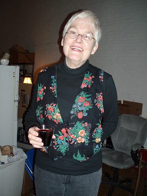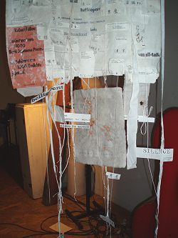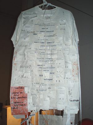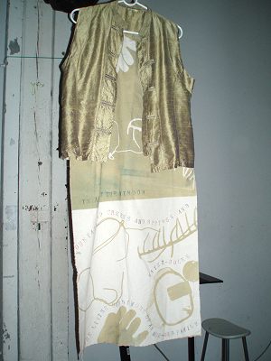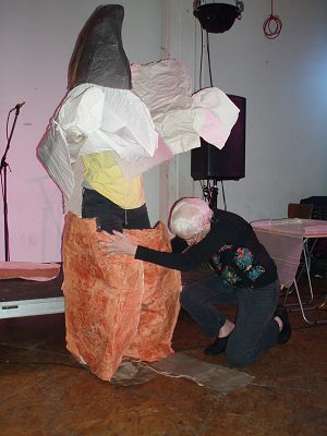 Zodra Alison binnenkomt herkent ze me. Ook zij is geen haar veranderd. Alleen loopt ze wat stroever dan voorheen. Zou ze reeds 80 zijn? Haar grijze haren en zachte ogen zijn identiek gebleven. Alsof we hebben afgesproken, dragen we beiden zwart met fleurige roze en turkooise bloemen. Het wordt een uitbundig weerzien, maar veel tijd is er niet, want ze moet nog haar ganse tentoonstelling opbouwen. Kledingstukken en zelfs gongs en trommels uit handgeschept papier.