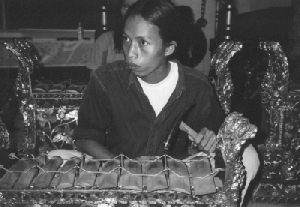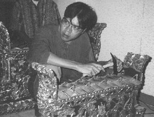 Het gebouw waarin hun Performing Arts Centre gehuisvest is, ziet er zeer sober en wat uitgeleefd uit. Het heeft iets van een kazerne in tropische stijl. Stug en streng rechte gangen, dunne metalen trapleuningen, afbladderende grijs- en blauwachtige verven, saaie bruine deuren... Wat een schril kontrast met de schitterende gamelan-instrumenten. Rood en goudkleur voeren hier de boventoon, temidden van een wirwar dekoratieve motieven, die nu eens abstrakt, dan weer in planten- of dierenmotieven zijn uitgewerkt. Godfried's instrumentarium van het "Shifts"-orkest, bestaat uit bronzen bonangs en hun Balinese tegenhangers, ook uit sarons, gongs, houten gambangs en eenenkele suling-fluit. Die speelt de gamelan-leraar. Helaas mogen de prachtige Indonesische cithers met de ronkende naam, chelempung, niet meespelen.