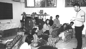 Pas tijdens het afsluitend vraag- en antwoord kwartiertje, merk ik Bintang op. Hij moet onhoorbaar ergens temidden van de sessie zijn binnengeslopen. Hij stelt een aantal vragen, die ik herken van tijdens het interview en staat erop dat ik, en niet Godfried of Joachim, zou antwoorden. We hebben het even kort over een samensmelten van diverse kulturele invloeden tot een mogelijke wereldkultuur, over wereldburgerschap en over diverse muzikale rituelen. Maar ik antwoord heel bondig, zodat ook de andere studenten nog aan het woord kunnen komen, iets wat Bintang duidelijk niet zint. Liefst had hij natuurlijk de 'Performing Arts Students' warm gemaakt en bestookt met het ganse ideeenarsenaal van tijdens het interview. Maar daar kan hier vanzelfsprekend geen sprake van zijn. Hij kijkt duidelijk misnoegd. Maar eens terug in Europa emailt hij uitvoerig en via de ambassade bekomen we een artikel uit de Jakarta Post van zijn hand, met daarin hoofdzakelijk de konflikttheorie van Godfried uitgewerkt. Wat mij op mijn beurt niet helemaal zint. Ik nodig hem uit, ons het integrale interview op te sturen voor publikatie in dit Logos-Blad, doch tot nu toe zonder resultaat. Ook hij heeft het te druk. Maar wie weet, volgende maand...