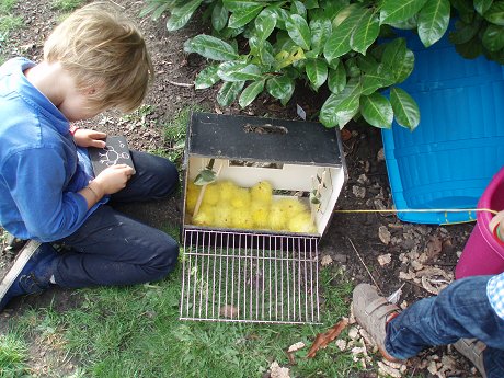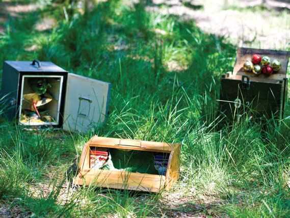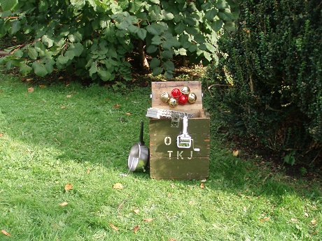 Trombonekist of Banana Box instrumentkoffer met lachboxen en bananen Wanneer de trombonekist gesloten is, dansen de piepende bananen vrolijk in het rond op de brombeermelodietjes die uit de lachboxen schallen. Doe je de doos open, dan houden de bananen zich muisstil en zou je denken dat er niets aan de hand is. Maar zodra de doos zich sluit, dansen de bananen opnieuw. Eigenlijk is het geen trombonekist, maar een echte Banana Box. Brooddoos met nest en Stille-Nacht-vogel Je zou kunnen denken dat je hier te maken hebt met een doodgewone brooddoos, maar niets is minder waar. Van zodra je de doos opent, denk je het te weten: "aha, het is een muziekdoos, of toch niet?" Deze doos hoort thuis in het muziekonderwijs. Met veel geduld en oefening helpt de vogel die je uit zijn nest kunt tillen je om Stille Nacht te leren spelen. Veel succes alvast. Legerkist of Legerdoos met reuze bellen en "kitchen tools" Uit een legerkist komen slechts akelige dingen: granaten, obussen en dergelijk onheilstuig. Maar deze legerdoos is anders. Schud maar eens: geen oorlog, maar kerstdagassociaties met rinkelende bellen. Eens geopend kan een vrolijk spel beginnen. Ver weg van afschuwelijk oorlogsgeraas. Groen Gras of Grasdoos alias Tomatensnijderdoos met margrietjes en o.a. een "tomato slicer" Met de tomatensnijder kan je proberen het altijd groene gras af te rijden, maar wat zonde van die margrietjes. Je kan dus maar beter met je nagels op de snijstaafjes van de "tomato slicer" tokkelen en wie weet groeien de bloemen sneller wanneer je zachtjes tegen hen neuriet. Kuikentjeskooi met vogelgeluidje De kuikentjes zijn allemaal dicht bij elkaar gekropen toen ze het vogelgepiep hoorden. Zo hebben ze het samen lekker warm en ging de vogel vliegen zonder dat iemand dit zag. |